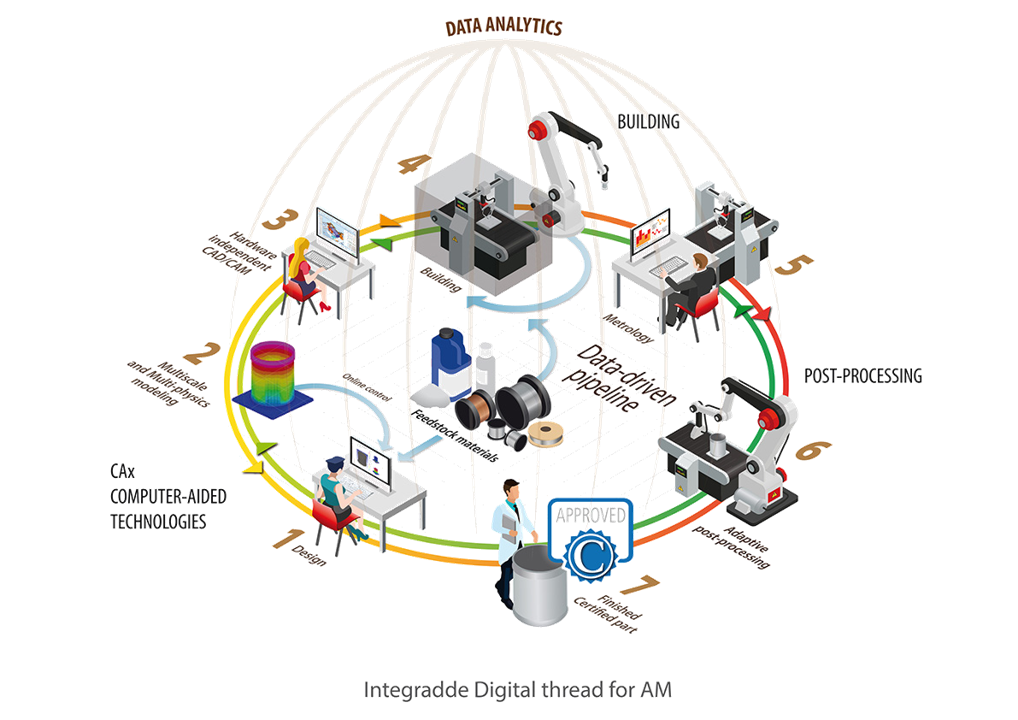 The main goals or steps that the Integradde project will take to achieve that are to develop novel multistage pilot plants based on DED processes, hybridizing AM with previous and subsequent processes for the manufacturing of several certified metal parts. Develop novel data-driven pipeline supporting the design, simulation and production planning for additive manufacturing. Implement a Quality-by-Design (QbD) manufacturing strategy, based on real-time control systems, inline quality control systems and minimized consumption of raw materials. The Integradde project also wants to Implement a digital end-to-end engineering concept and demonstrate INTEGRADDE approach in several pilot lines for the manufacturing of certified metal parts.